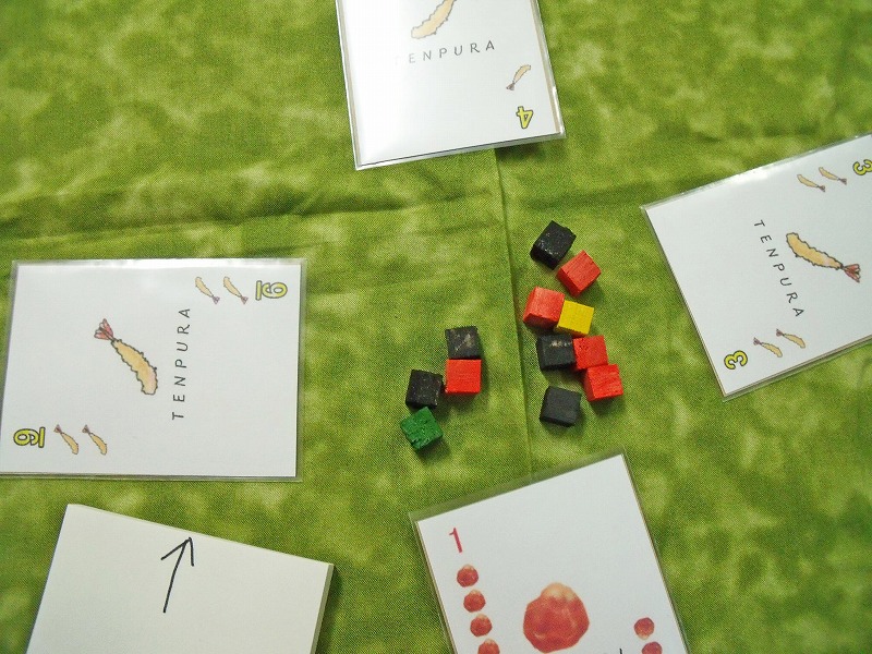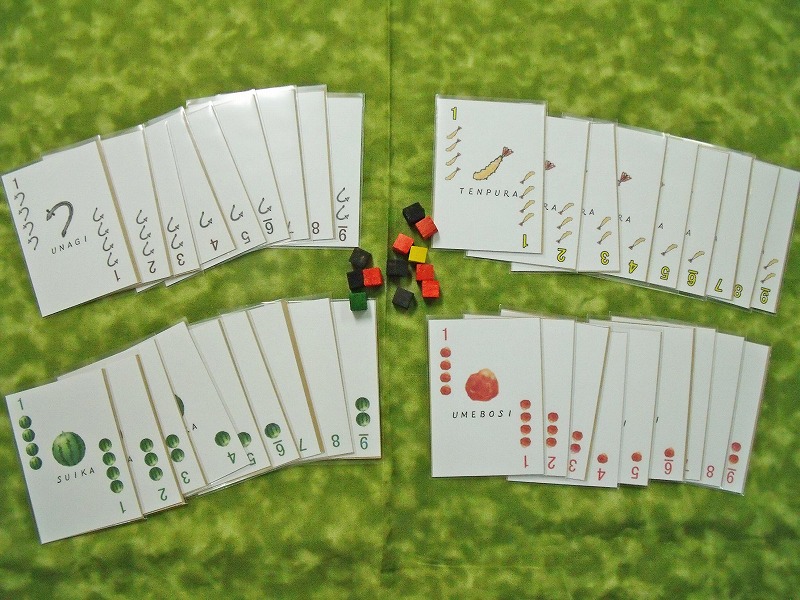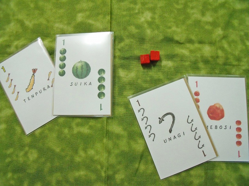 スーパーマーケットは毎回決まった容量内に商品を納めましたが、今回はなるべくうまぎと梅干、すいかと天ぷらのカードセットを揃えないようプレイすることになります。