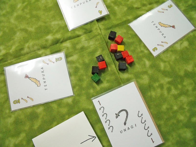つまり、最初に天ぷら9、天ぷら4、天ぷら3とカードが場に出て最後のプレーヤーが手札に天ぷらがない場合、うなぎを出すことで今回うなぎが一番強い絵柄になり、トリックを取るというものです。